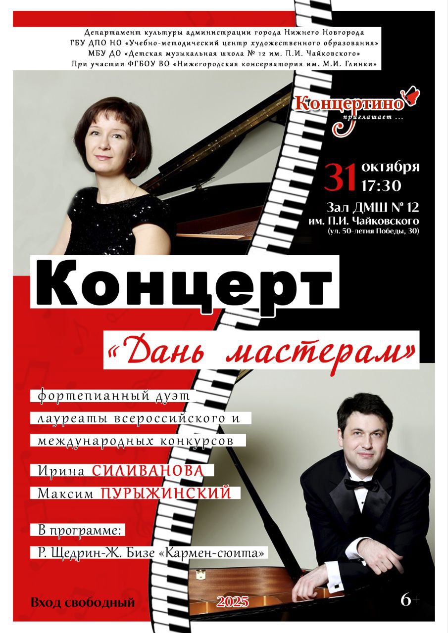 | НОВОСТИДо новых встреч на наших концертах!ВНИМАНИЕ!Рады анонсировать выход в свет Хрестоматии для фортепианного дуэта! Приобрести ее можно на наших концертах.| 2025 - 2026>> Ставрополь – 16-17.09.2025 Максим - член жюри конкурса "Студенческая весна" >> Москва – 18.09.2025 Рахманиновский зал консерватории Диалог двух столиц Чайковский, Рахманинов, Шостакович анонс >> билеты >> >> Белгород – 26.09.2025 Белгородская филармония Бизе-Щедрин, Прокофьев >> Москва – 28.09.2025 Московский международный Дом музыки, Камерный зал Чайковский, Шуман Песочная анимация - Марина Чистина билеты >> >> Москва – 01.10.2025 Зеркальный зал, Козицкий пер., 5 Шуман, Брамс, Чайковский >> Москва – 02.10.2025 Зеркальный зал, Козицкий пер., 5 Шуман, Брамс, Чайковский >> Москва – 05.10.2025 Московская филармония представляет: Абонемент № 262. Дневник веселых историй Начало в 12.00 билеты >> >> Москва – 12.10.2025 Российская Академия музыки Связь поколений регистрация >> >> Москва – 19.10.2025 Архиповский салон 5-летие создания Школы Виктора Маевского >> Пенза – 22.10.2025 Ирина и Максим проводят мастер-классы в музыкальном колледже билеты >> >> Пенза – 22.10.2025 Пензенская филармония Бизе-Щедрин, Прокофьев >> Саранск – 23.10.2025 Ирина и Максим проводят мастер-классы в музыкальном колледже >> Саранск – 23.10.2025 Мордовская филармония Бизе-Щедрин, Прокофьев >> Ульяновск – 24.10.2025 Ирина и Максим проводят мастер-клаcc >> Ульяновск – 25.10.2025 Ульяновская филармония Григ, Брамс, Равель, Чайковский >> Улан-Удэ – 27-29.10.2025 Максим проводит мастер-клаcc >> Нижний Новгород – 31.10.2025 Ирина и Максим проводят мастер-класс >> Нижний Новгород – 31.10.2025 Бизе-Щедрин анонс >> >> Самара – 02-04.11.2025 Максим - председатель жюри конкурса фортепианных дуэтов им. Н.Петрова >> Москва – 09.11.2025 Максим - член жюри конкурса "Роза ветров" >> Москва – 10.11.2025 Концерт-посвящение юбилею А.З.Бондурянского Большой зал консерватории анонс >> билеты >> >> Саратов – 11.11.2025 Саратовская консерватория Максим проводит мастер-клаcc анонс >> >> Москва – 18.11.2025 РАМ им. Гнесиных, Большой зал Памяти Щедрина... анонс >> билеты >> >> Москва – 29.11.2025 Московский международный Дом музыки, Камерный зал Чайковский, Вагнер Песочная анимация - Марина Чистина билеты >> >> Архангельск – 06.12.2025 Архангельская филармония Бизе-Щедрин, Прокофьев >> Хабаровск – 12.12.2025 Ирина и Максим проводят мастер-класс в музыкальном колледже >> Хабаровск – 13.12.2025 Хабаровская филармония Моцарт, Сен-Санс анонс >> билеты >> >> Коломна – 20.12.2025 Максим - член жюри молодежного конкурса >> Москва – 21.12.2025 Рахманиновский зал консерватории Новогодний концерт анонс >> билеты >> >> Москва – 02.01.2026 Московский международный Дом музыки, Камерный зал Щелкунчик Песочная анимация - Марина Чистина >> Курган – 08.02.2026 Курганская филармония Бах >> Москва – 14.02.2026 Московский международный Дом музыки, Камерный зал Чайковский, Дебюсси, Форе Песочная анимация - Марина Чистина билеты >> >> Москва – 03.03.2026 Малый зал консерватории Прокофьев билеты >> >> Санкт-Петербург – 07.03.2026 Санкт-Петербургская филармония Бизе-Щедрин, Прокофьев >> Великий Новгород – 09.04.2026 Новгородская филармония Оркестровые транскрипции, сделанные Максимом Пурыжинским >> Кострома – 18.04.2026 Костромская филармония Бизе-Щедрин >> Липецк – 14.05.2026 Липецкая филармония >> Ставрополь – 22.05.2026 Ставропольская филармония Искренне Ваши Ирина, Максим Архив 2024 - 2025 Архив 2023 - 2024 Архив 2022 - 2023 Архив 2021 - 2022 Архив 2020 - 2021 Архив 2019 - 2020 Архив 2018 - 2019 Архи
